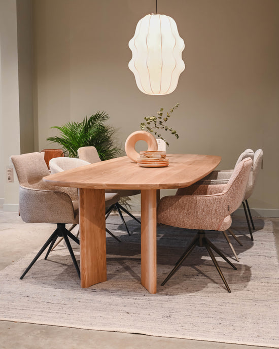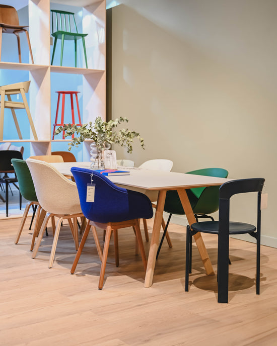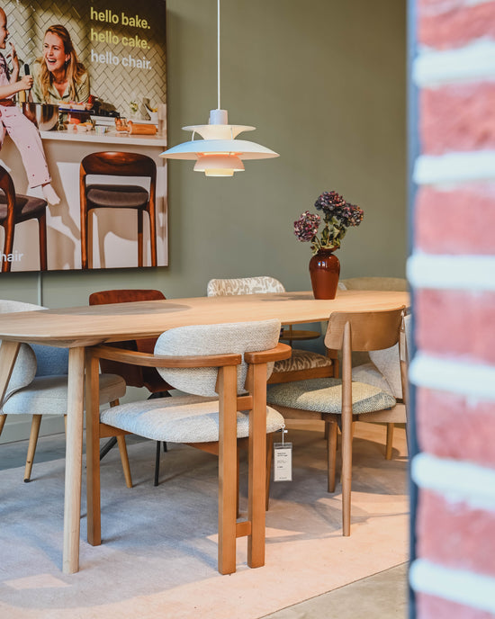 Veel stoelen en tafels zijn in talloze variaties leverbaar. Niet alle varianten staan online maar In de winkel vind je alle stof- en kleurstalen en helpen we je met het samenstellen van jouw ideale meubel.