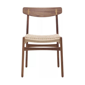 Ook de CH23 eetkamerstoel is een door Hans J. Wegner ontworpen design klassieker, het ontwerp stamt uit 1950. Het dubbel gevlochten papierkoord loopt een klein beetje over de rand van de zijkant van de stoel en zorgt voor een extra bijzonder karakter. De rugleuning is bijzonder fraai en praktisch en wordt evenals de rest van de stoel uitgevoerd in gezeept eikenhout, en de manier waarop de rugleuning is bevestigd aan het frame is erg fraai zichtbaar. Gezeept eikenhout geeft een onbewerkte en fraaie uitstraling, maar vergt wel iets meer onderhoud dan geolied eikenhout. Voor dagelijks onderhoud volstaat een schone zachte doek die is uitgewrongen.