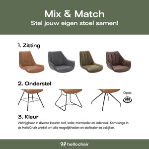 Deze eetkamerstoel is onderdeel van de Comodo Mix & Match-collectie. Het leuke hiervan is dat je de stoel zelf kunt samenstellen. Je kiest de zitting, het onderstel en de bekleding (stof, leder, microleder of lederlook) die jij mooi vindt. Kom langs in de HelloChair winkel om alle mogelijkheden en stofstalen te bekijken. We helpen je graag om een stoel te vinden die bij jouw interieur past!