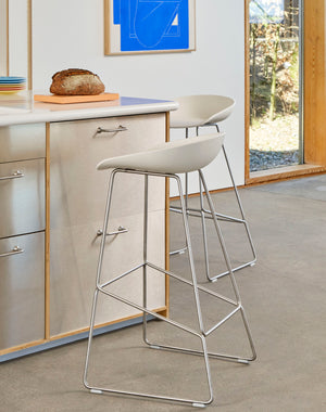 De About a Stool AAS 38 barkruk van HAY heeft een simplistisch design maar zit verrassend comfortabel. De kuip is gemaakt van onderhoudsvrij kunststof en staat op stevige, stalen poten. Het slanke onderstel geeft je eetkamer of keuken een heel ruimtelijk gevoel, je kunt er dus gerust meerdere bij elkaar zetten. De voetensteun zorgt voor extra comfort en heeft een hoogte van 24 cm.