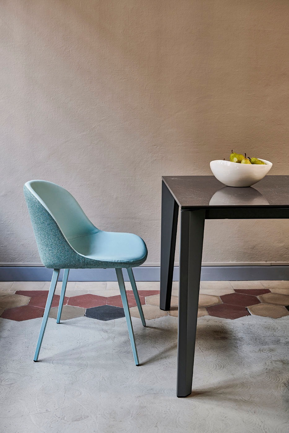 De stoel is gestoffeerd met de stof Cotton Club in de kleur Light grey. Het onderstel is gemaakt van een vierkante poot van gelakt staal.